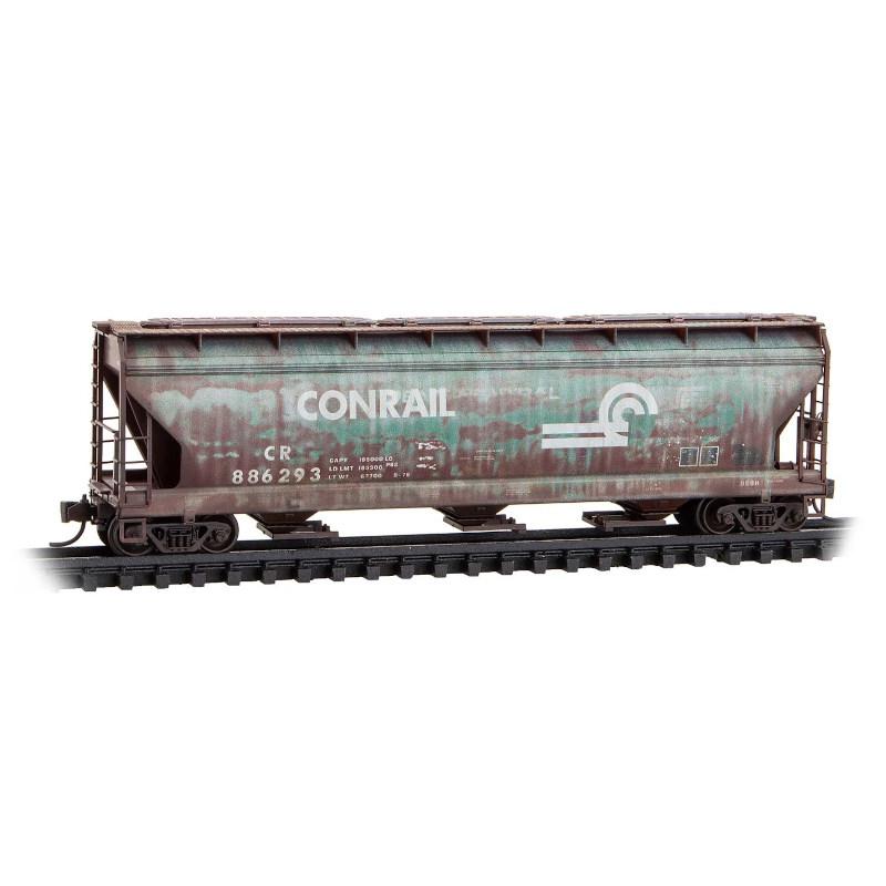 This 100-ton three-bay hopper with Barber Roller Bearing trucks was built for New York Central, and was later repainted in New York Central green. Some years later it was painted Conrail hopper red. New York Central merged with its rival, the Pennsylvania Railroad, in 1968 to form Penn Central, which went bankrupt two years later and was merged into Conrail in 1976.
